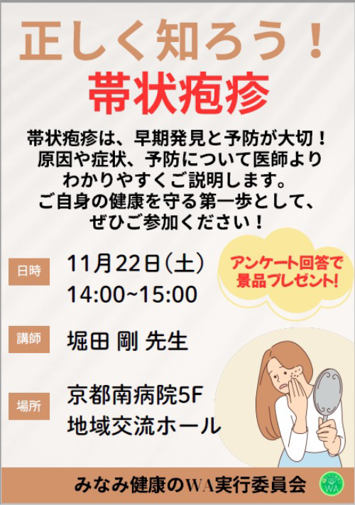 11月22日(土)にみなみ健康のWAを開催します。 帯状疱疹の原因や症状、予防について医師よりわかりやすくご説明します。 アンケ―ト回答で景品もプレゼントしますので、皆さま是非お越しください!!