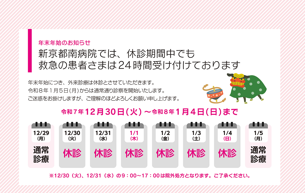 年末年始につき、外来診療は休診とさせていただきます。 2026(令和8)年1月5日(月)から通常通り診察を開始いたします。 ご迷惑をおかけいたしますが、ご理解のほどよろしくお願いいたします。
