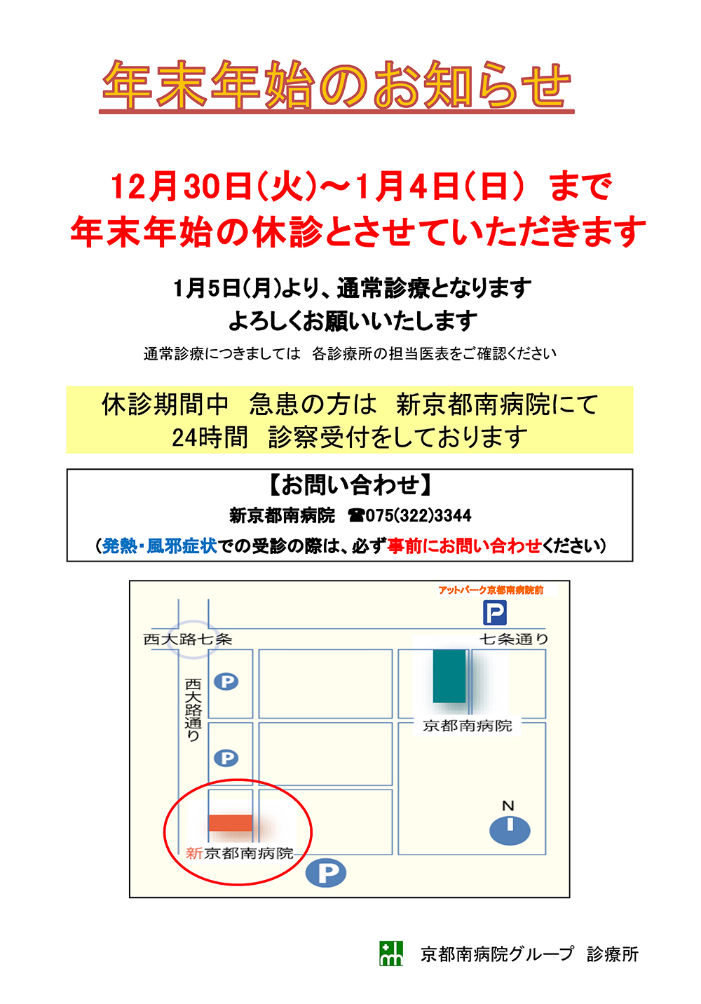 京都南病院グループの診療所は、12月30日(火)から1月4日(日)まで休診とさせていただきます。 年末は29日(月)まで、年始は2026(令和8)年1月5日(月)より通常診察となります。