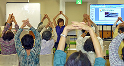 当日は、内浜診療所通所リハビリの、叶・山本 両介護福祉士が講師を務め、診療所通所リハビリの紹介に始まり、自宅で出来るリハビリ体操、頭の体操など、盛り沢山の内容で、ラストは楽器伴奏にあわせて全員で合唱し閉会となりました。